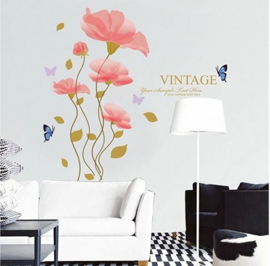 ウォールステッカー ヴィンテージフラワー 壁シール 綺麗な ピンクの花 青い蝶々 欧風 英文字 結婚式 プレゼント 貼り直せる 壁ステッカー