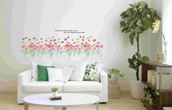 ウォールステッカー 明るい花畑と蝶々 壁シール ガーデン風 ピンク 黄色いフラワー 賃貸 子供部屋 リビングに はがせる インテリアシール