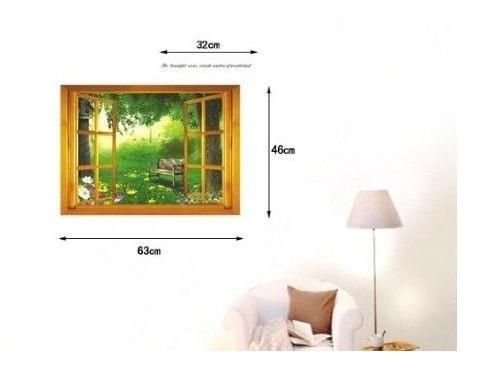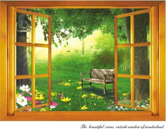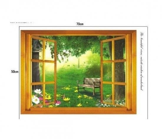 ウォールステッカー 窓枠 ビューティフルガーデン 壁シール 花と緑の風景 ベンチと美しい庭 茶色 木枠 便所 廊下 癒される インテリアシール
