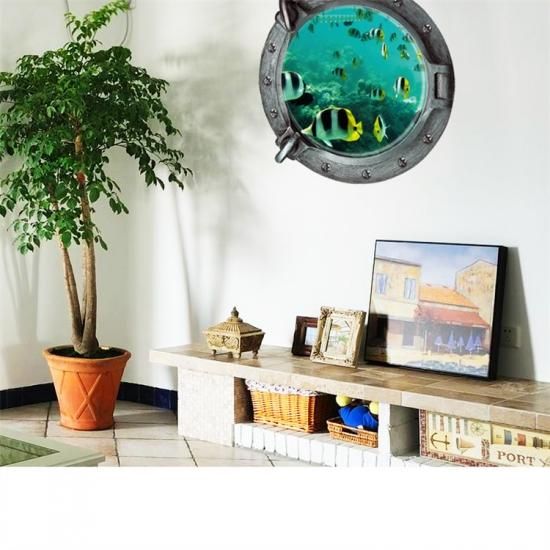 ウォールステッカー 潜水艦窓から 熱帯魚 3D壁シール 綺麗な 海底 鑑賞 ブルー 覗く 3次元 ベッドルーム 居間 貼り直せる インテリア 小物雑貨