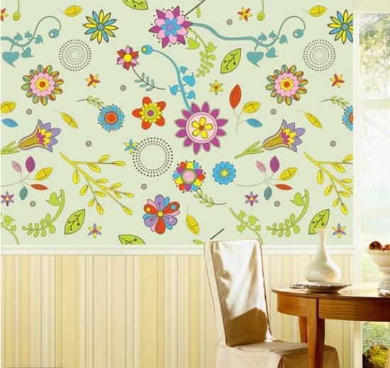 ウォールステッカー カラフルフラワー 花柄 壁シール 南欧 ファブリック調 色とりどり エスニック サイケデリック 赤 青 紫 黄緑 黄色 貼り直せる 壁ステッカー